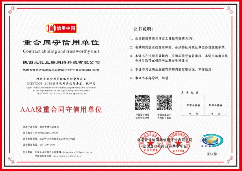 2020年6月,无忧互联荣获信用中国-AAA级重合同守信用单位。