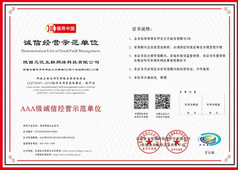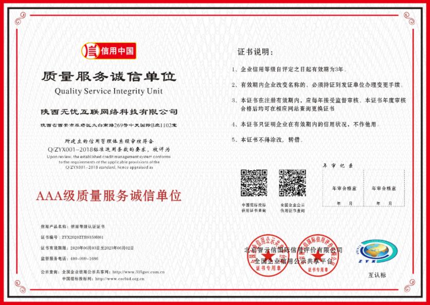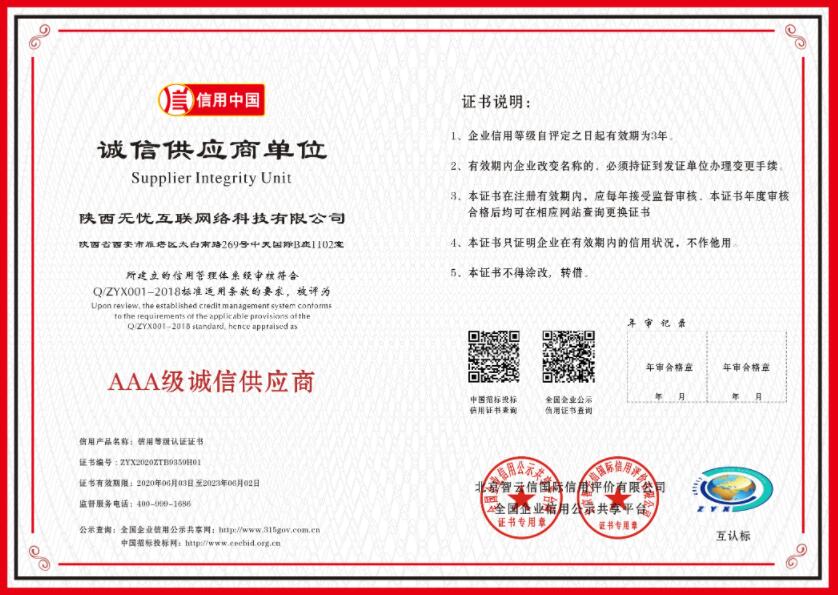 2020年6月,无忧互联荣获信用中国-AAA级诚信供应商。