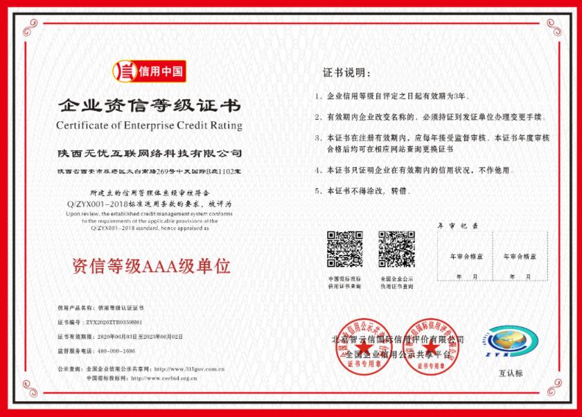 2020年6月,无忧互联荣获信用中国-企业信用等级AAA证书。